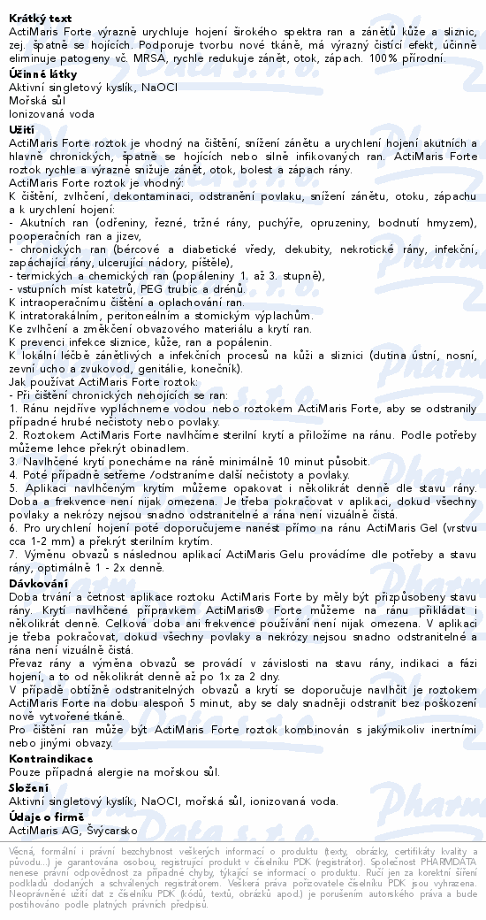 ActiMaris Forte výrazně urychluje hojení širokého spektra ran a zánětů kůže a sliznic, zej. špatně se hojících. Podporuje tvorbu nové tkáně, má výrazný čistící efekt, účinně eliminuje patogeny vč. MRSA, rychle redukuje zánět, otok, zápach. 100% přírodní.