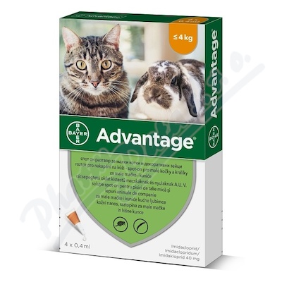 Advantage 40 mg roztok pro nakapání na kůži – spot-on pro malé kočky a králíky do 4 kg. Prevence a léčba napadení koček blechami. Léčba napadení králíků blechou kočičí při společném chovu králíků a psů