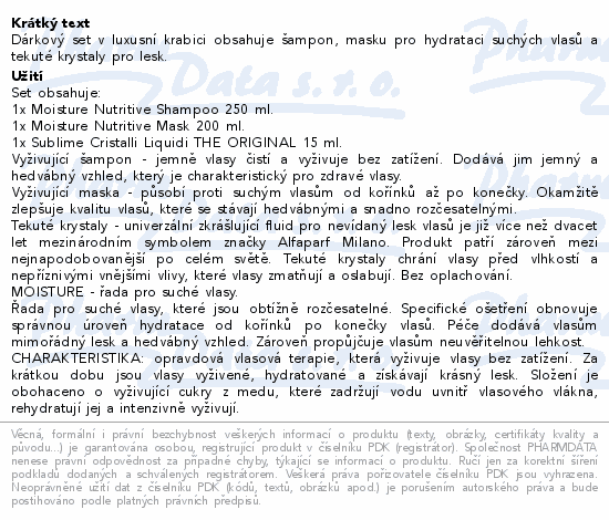 Dárkový set v luxusní krabici obsahuje šampon, masku pro hydrataci suchých vlasů a tekuté krystaly pro lesk.