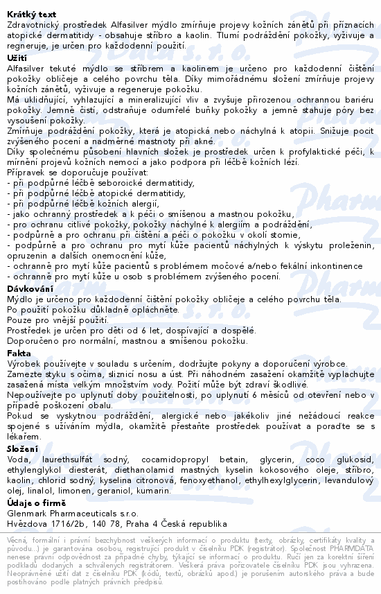 Zdravotnický prostředek Alfasilver mýdlo zmírňuje projevy kožních zánětů při příznacích atopické dermatitidy - obsahuje stříbro a kaolin. Tlumí podráždění pokožky, vyživuje a regneruje, je určen pro každodenní použití.