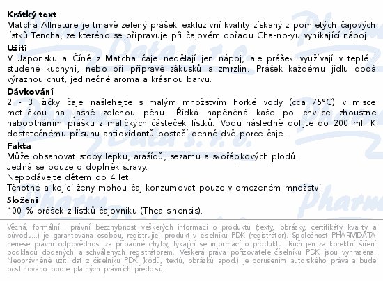 Matcha Allnature je tmavě zelený prášek exkluzivní kvality získaný z pomletých čajových lístků Tencha, ze kterého se připravuje při čajovém obřadu Cha-no-yu vynikající nápoj.