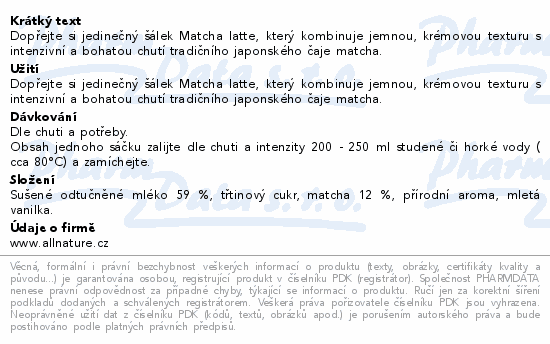 Allnature Matcha latte bez laktózy 270g