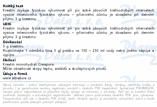 Allnature Kreatin monohydrát s příchutí grepu, ve formě jemného prášku k přípravě nápoje, se sladidlem.