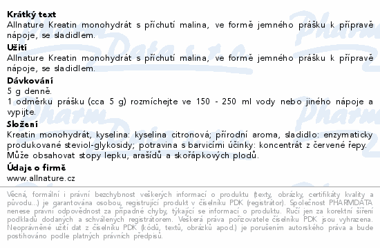 Allnature Kreatin monohydrát s příchutí malina, ve formě jemného prášku k přípravě nápoje, se sladidlem.