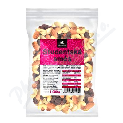 Allnature Studentská směs je chutná kombinace jader mandlí, kešu ořechů, lískových ořechů a rozinek.