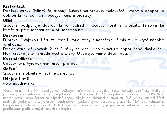 Bylinný čaj, porcovaný v nálevových sáčcích. Doplněk stravy. Pro normální funkci močové soustavy a prostaty.