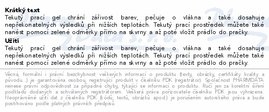 Tekutý prací gel chrání zářivost barev, pečuje o vlákna a také dosahuje nepřekonatelných výsledků při nižších teplotách. Tekutý prací prostředek můžete také nanést pomocí zelené odměrky přímo na skvrny a až poté vložit prádlo do pračky.