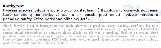 Kyselina acetylsalicylová snižuje tvorbu prostaglandinů (fyziologicky účinných sloučenin, které se podílejí na vzniku zánětu), a tím působí proti bolesti, snižuje horečku a potlačuje záněty. Čtěte pozorně příbalový leták.