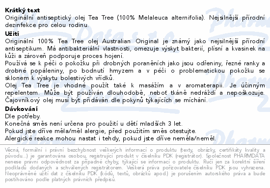Originální antiseptický olej Tea Tree (100% Melaleuca alternifolia). Nejsilnější přírodní dezinfekce pro celou rodinu.