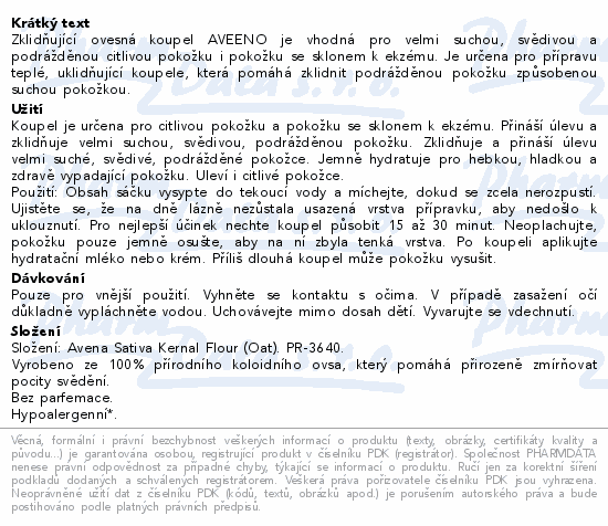 Zklidňující ovesná koupel AVEENO je vhodná pro velmi suchou, svědivou a podrážděnou citlivou pokožku i pokožku se sklonem k ekzému. Je určena pro přípravu teplé, uklidňující koupele, která pomáhá zklidnit podrážděnou pokožku způsobenou suchou pokožkou.
