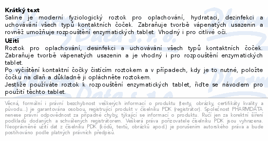 Saline je moderní fyziologický roztok pro oplachování, hydrataci, dezinfekci a uchovávání všech typů kontaktních čoček. Zabraňuje tvorbě vápenatých usazenin a rovněž umožňuje rozpouštění enzymatických tablet. Vhodný i pro citlivé oči.