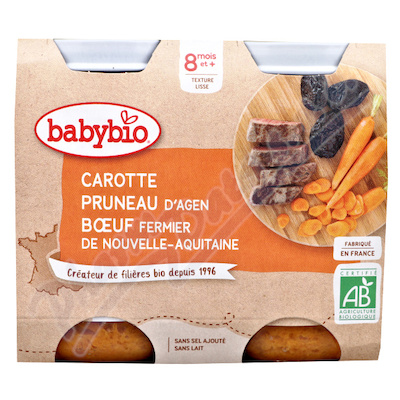 Hlavní chod pro opravdové gurmány. Farmářské hovězí maso z ekochovu v oblasti Nouvelle Aquitaine, sušené švestky a lahodná mrkev. Bio suroviny. Pro děti od 8 měsíců. Bez přidané soli, zahušťovadel, umělých dochucovadel a konzervantů. Připraveno na páře.