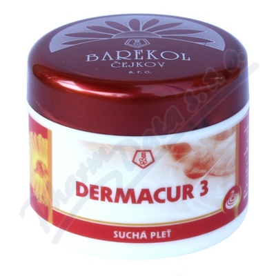 Lehký výživný mastný krém vynikajících vlastností. Poměr vodní a olejové složky odpovídá přirozené hodnotě mladé zdravé pleti. Obsahuje vitamin E, panthenol a speciální měsíčkový extrakt. Dermacur 3 je noční krém a zároveň denní krém pro suchou pleť.