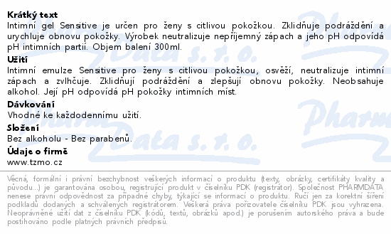 Intimní gel Sensitive je určen pro ženy s citlivou pokožkou. Zklidňuje podráždění a urychluje obnovu pokožky. Výrobek neutralizuje nepříjemný zápach a jeho pH odpovídá pH intimních partií. Objem balení 300ml.