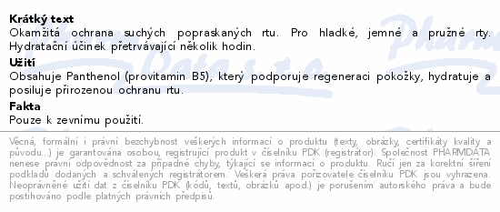 Okamžitá ochrana suchých popraskaných rtu. Pro hladké, jemné a pružné rty. Hydratační účinek přetrvávající několik hodin.