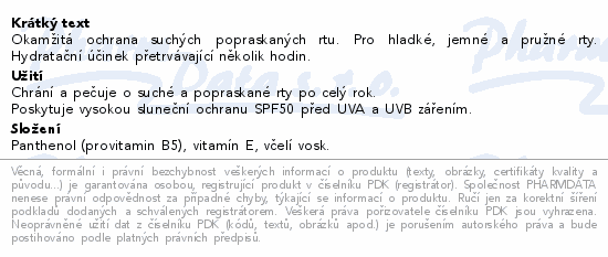 Okamžitá ochrana suchých popraskaných rtu. Pro hladké, jemné a pružné rty. Hydratační účinek přetrvávající několik hodin.