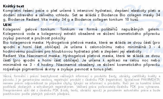 Kompletní řešení péče o pleť určené k intenzivní hydrataci, zlepšení elasticity pleti a dodání zdravého a zářivého vzhledu. Set se skládá z Biodance Bio colagen masky 34 g, Biodance Radiant Vita masky 34 g a Biodance collagen tonikum 10 kusů.
