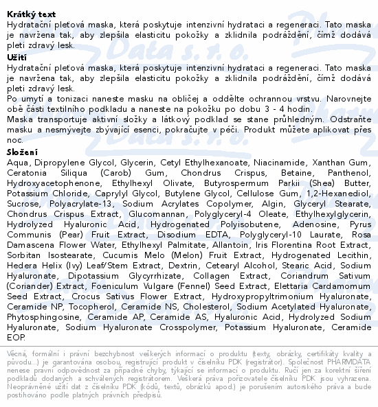 Hydratační pleťová maska, která poskytuje intenzivní hydrataci a regeneraci. Tato maska je navržena tak, aby zlepšila elasticitu pokožky a zklidnila podráždění, čímž dodává pleti zdravý lesk.
