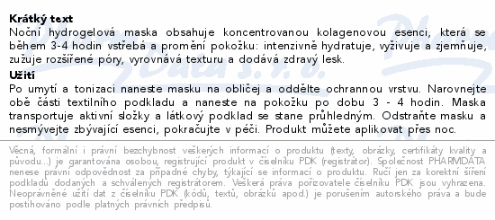 Noční hydrogelová maska obsahuje koncentrovanou kolagenovou esenci, která se během 3-4 hodin vstřebá a promění pokožku: intenzivně hydratuje, vyživuje a zjemňuje, zužuje rozšířené póry, vyrovnává texturu a dodává zdravý lesk.
