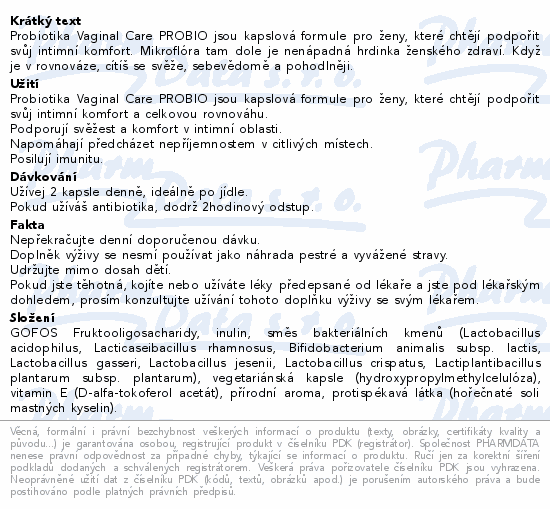 Probiotika Vaginal Care PROBIO jsou kapslová formule pro ženy, které chtějí podpořit svůj intimní komfort. Mikroflóra tam dole je nenápadná hrdinka ženského zdraví. Když je v rovnováze, cítíš se svěže, sebevědomě a pohodlněji.