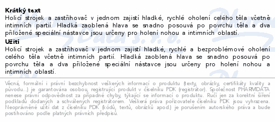 Holicí strojek a zastřihovač v jednom zajistí hladké, rychlé oholení celého těla včetně intimních partií. Hladká zaoblená hlava se snadno posouvá po povrchu těla a dva přiložené speciální nástavce jsou určeny pro holení nohou a intimních oblastí.
