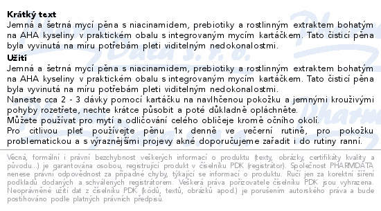 Jemná a šetrná mycí pěna s niacinamidem, prebiotiky a rostlinným extraktem bohatým na AHA kyseliny v praktickém obalu s integrovaným mycím kartáčkem. Tato čisticí pěna byla vyvinutá na míru potřebám pleti viditelným nedokonalostmi.