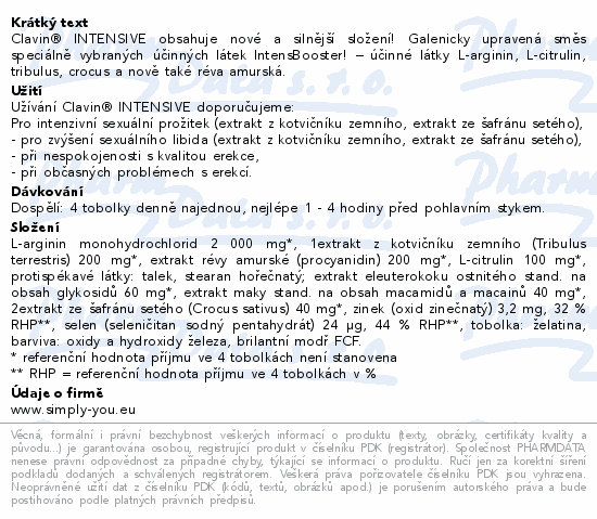 Clavin® INTENSIVE obsahuje nové a silnější složení! Galenicky upravená směs speciálně vybraných účinných látek IntensBooster! – účinné látky L-arginin, L-citrulin, tribulus, crocus a nově také réva amurská.