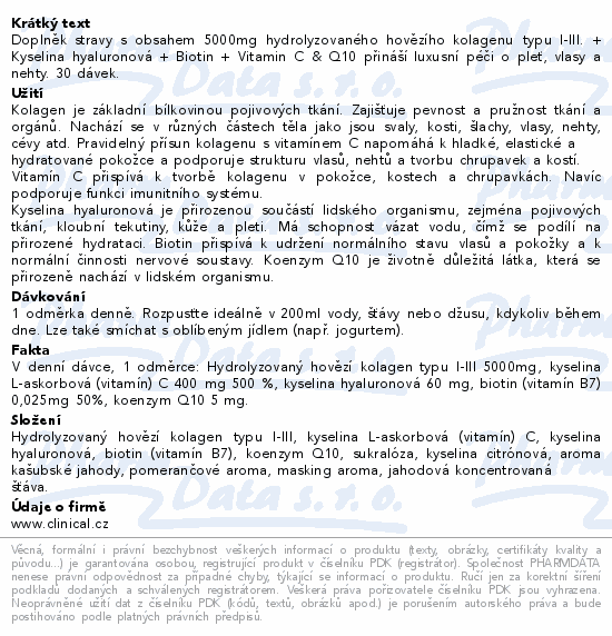 Doplněk stravy s obsahem 5000mg hydrolyzovaného hovězího kolagenu typu I-III. + Kyselina hyaluronová + Biotin + Vitamin C & Q10 přináší luxusní péči o pleť, vlasy a nehty. 30 dávek.