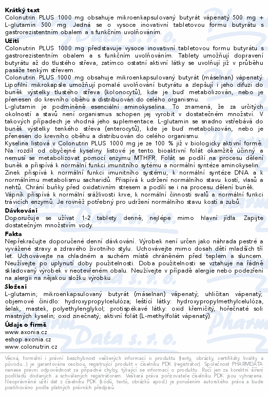Colonutrin PLUS 1000 mg obsahuje mikroenkapsulovaný butyrát vápenatý 500 mg + L-glutamin 500 mg. Jedná se o vysoce inovativní tabletovou formu butyrátu s gastrorezistentním obalem a s funkčním uvolňováním.