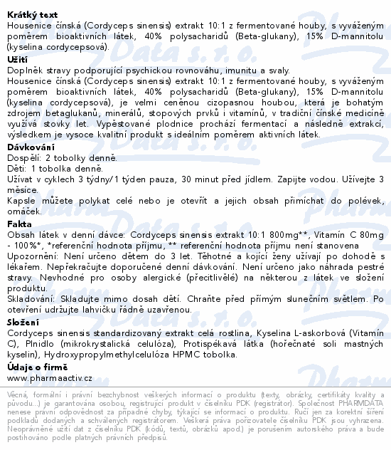 Přípravek z Housenice čínské s optimálním obsahem 40 % polysacharidů (účinných látek). Představuje bohatý zdroj tělu...