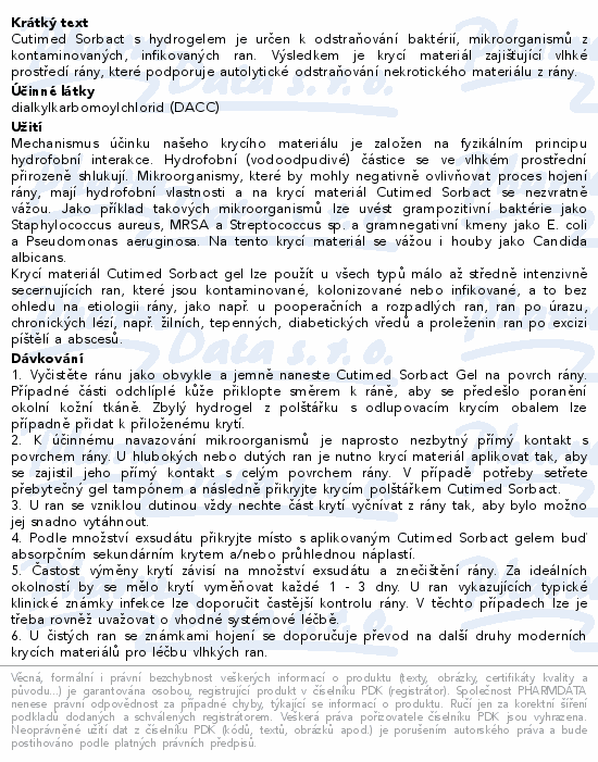 Cutimed Sorbact s hydrogelem je určen k odstraňování baktérií, mikroorganismů z kontaminovaných, infikovaných ran. Výsledkem je krycí materiál zajišťující vlhké prostředí rány, které podporuje autolytické odstraňování nekrotického materiálu z rány.