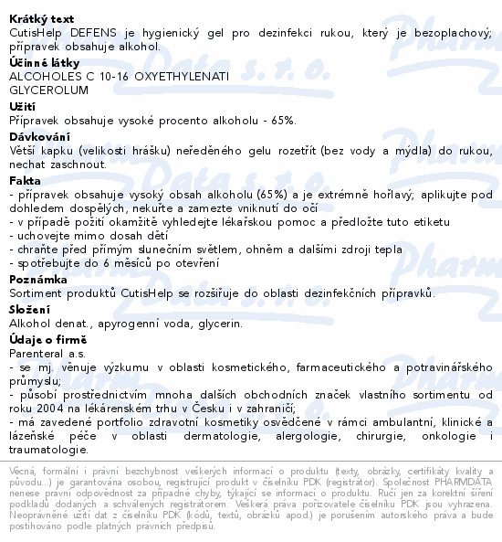 CutisHelp DEFENS je hygienický gel pro dezinfekci rukou, který je bezoplachový; přípravek obsahuje alkohol.