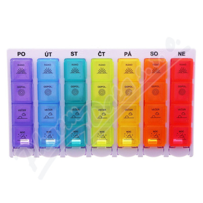 Týdenní dávkovač léků je rozdělen na 7 dní v týdnu pomocí zkratek názvů dnů v týdnu a každý den má 3 části - ráno,...