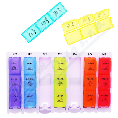 Dávkovač léků je rozdělen na 7 částí nebo pomocí zkratek názvů dnů v týdnu. Každý den se otevírá samostatně pomocí...