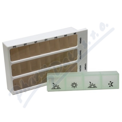 Jedná se o dávkovač - kazetu na léky na celý týden v setu s denním dávkovačem na léky, který má 4 přihrádky a slouží k přehlednému a spolehlivému dávkování a uložení léků doma i na cestách.