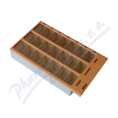 Slouží k přehlednému uspořádání a spolehlivému dávkování léků či potravinových doplňků doma i na cestách. Je označen jednoduchými popisky zobrazujícími denní dobu. Dostupný v několika barevných provedeních. Velikost dávkovače 136 x 81 x 25 mm (d x š x v)
