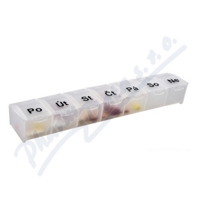 Dávkovač léků je rozdělen na 7 částí nebo pomocí zkratek názvů dnů v týdnu. Každý den se otevírá samostatně pomocí...