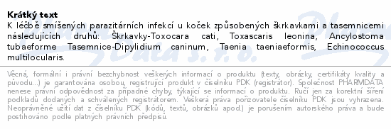 K léčbě smíšených parazitárních infekcí u koček způsobených škrkavkami a tasemnicemi následujících druhů:...