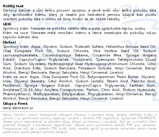 Dárkový balíček s vůní šeříku provoní opojnou a jarně svěží vůní šeříku pokožku těla díky sprchového krému, který je ideální pro hedvábně jemnou koupel bez pocitu vysušení pokožky těla a krému na ruce, hodící se do každé kabelky.