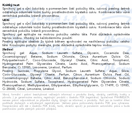 Sprchový gel s vůní čokolády s pomerančem čistí pokožku těla, cukrový peeling šetrně odstraňuje odumřelé kožní buňky prostřednictvím krystalků cukru. Kombinace této vůně zanechává pokožku krásně provoněnou.
