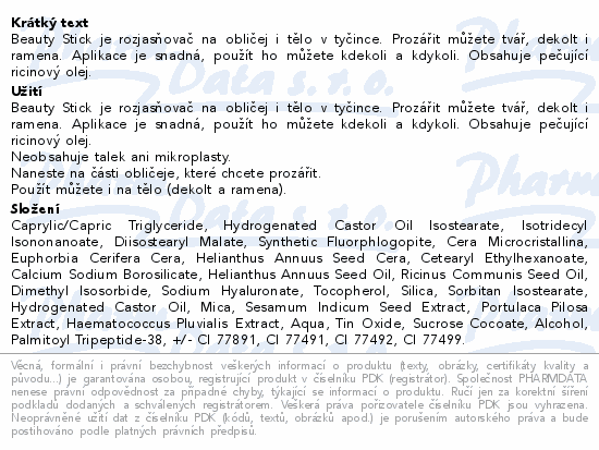 Beauty Stick je rozjasňovač na obličej i tělo v tyčince. Prozářit můžete tvář, dekolt i ramena. Aplikace je snadná, použít ho můžete kdekoli a kdykoli. Obsahuje pečující ricinový olej.