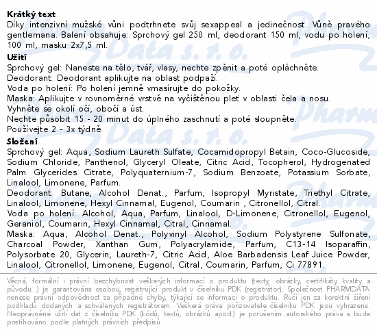 Díky intenzivní mužské vůni podtrhnete svůj sexappeal a jedinečnost. Vůně pravého gentlemana. Balení obsahuje: Sprchový gel 250 ml, deodorant 150 ml, vodu po holení, 100 ml, masku 2x7, 5 ml.