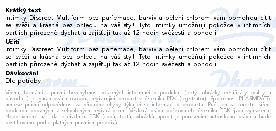 Intimky Discreet Multiform bez parfemace, barviv a bělení chlorem vám pomohou cítit se svěží a krásná bez ohledu na váš styl! Tyto intimky umožňují pokožce v intimních partiích přirozeně dýchat a zajišťují tak až 12 hodin svěžesti a pohodlí.