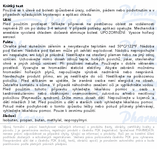 Používá se k úlevě od bolesti způsobené úrazy, odřením, pádem nebo podvrtnutím a v případech vyžadujících kryoterapii a...