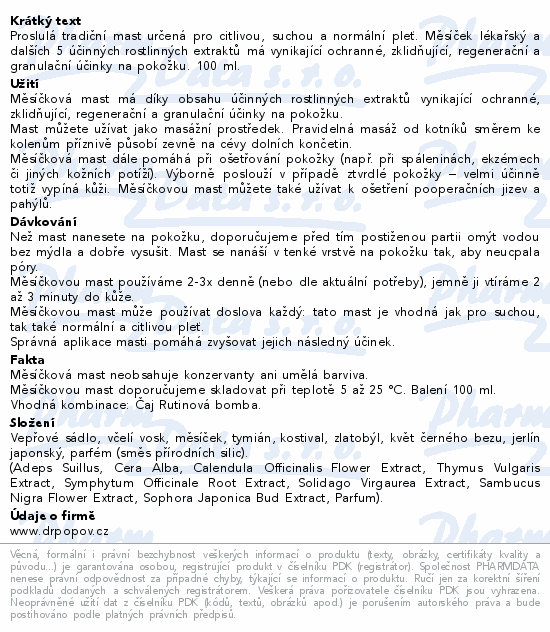 Proslulá tradiční mast určená pro citlivou, suchou a normální pleť. Měsíček lékařský a dalších 5 účinných rostlinných extraktů má vynikající ochranné, zklidňující, regenerační a granulační účinky na pokožku. 100 ml.