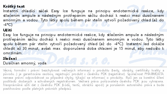 Instantní chladící sáček Easy Ice funguje na principu endotermické reakce, kdy stlačením ampule a následným protřepáním sáčku dochází k reakci mezi dusičnanem amonným a vodou. Tyto látky spolu během pár vteřin vytvoří požadovaný chlad (až do -4°C).