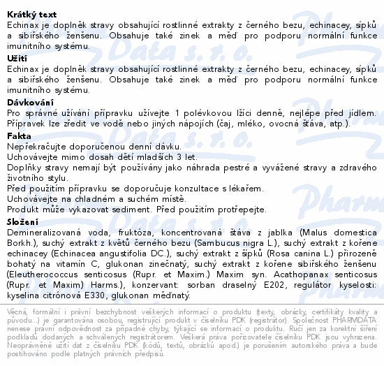 Echinax je doplněk stravy obsahující rostlinné extrakty z černého bezu, echinacey, sípků a sibiřského ženšenu. Obsahuje také zinek a měď pro podporu normální funkce imunitního systému.