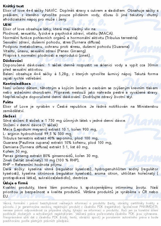 Elixir of love 4+4 sáčky NAVÍC. Doplněk stravy s cukrem a sladidlem. Obsahuje sáčky s práškem, z kterého vytvoříte pouze přidáním vody, džusu či jiné tekutiny chutný afrodiziakální nápoj pro muže i ženy.