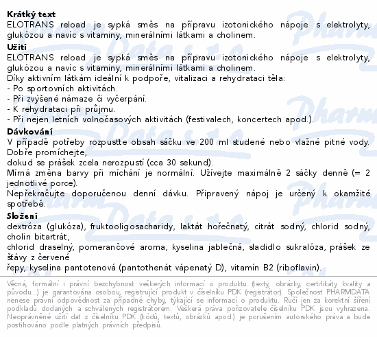 ELOTRANS reload je sypká směs na přípravu izotonického nápoje s elektrolyty, glukózou a navíc s vitaminy, minerálními látkami a cholinem.