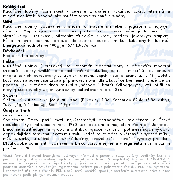 Kukuřičné lupínky (cornflakes) - cereálie z uvařené kukuřice, cukru, vitamínů a minerálních látek. Vhodné jako součást zdravé snídaně a svačiny.